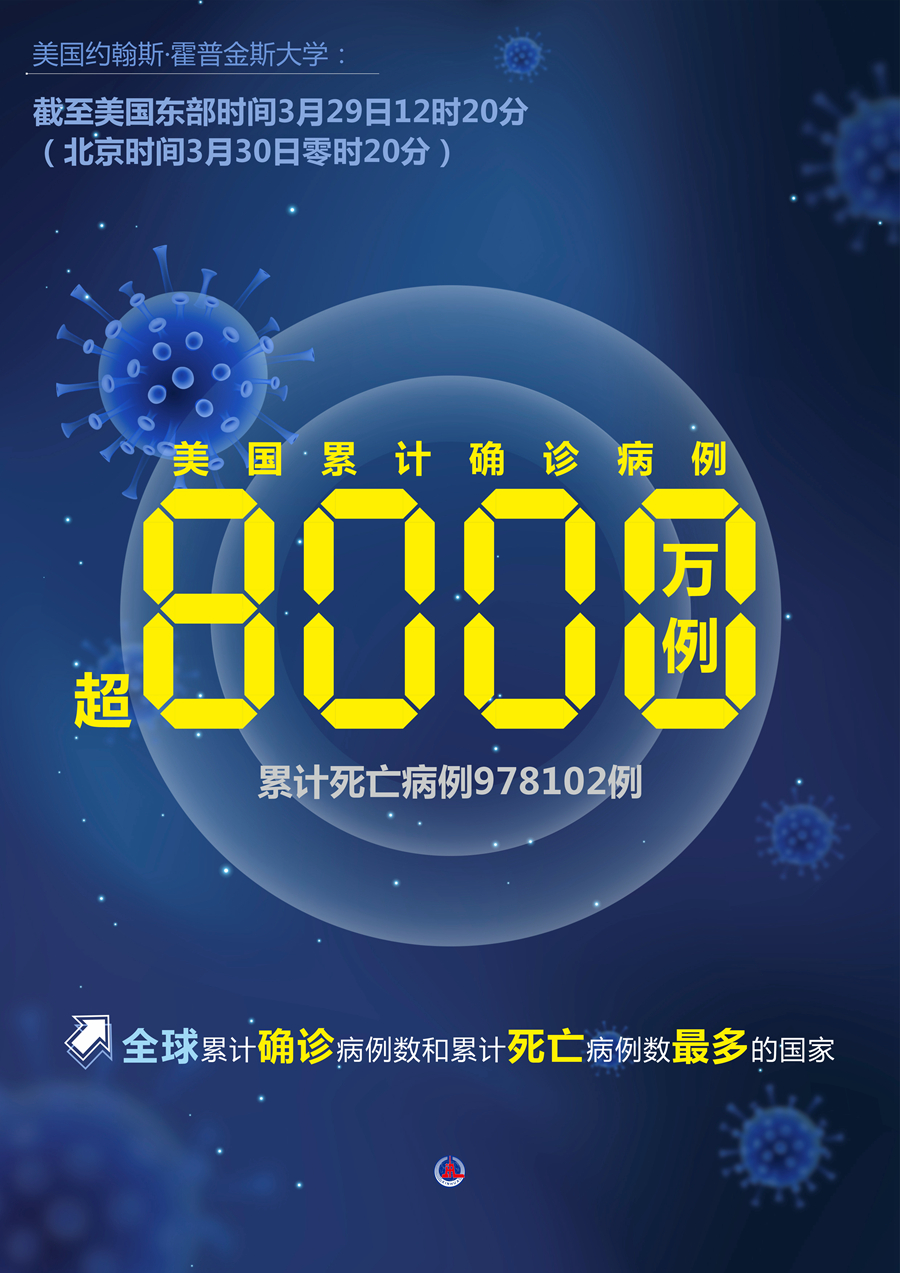 紐約3月29日電 美國(guó)約翰斯·霍普金斯大學(xué)29日發(fā)布的新冠疫情最新統(tǒng)計(jì)數(shù)據(jù)顯示,美國(guó)累計(jì)確診病例超過8000萬例。